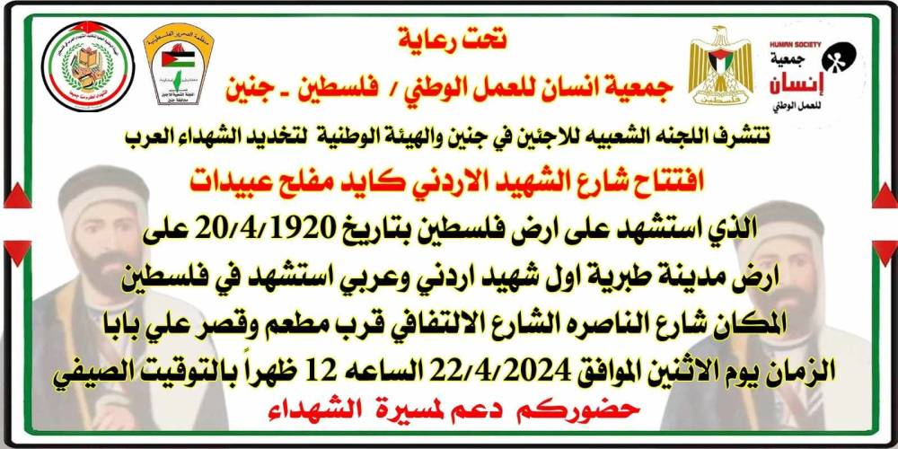 / عشيرة العبيدات ، لجمعية إنسان للعمل الوطني في فلسطين / جنين ، على تسمية إحدى شوارع مدينة جنين پاسم الشهيد كايد المفلح عبيدات .