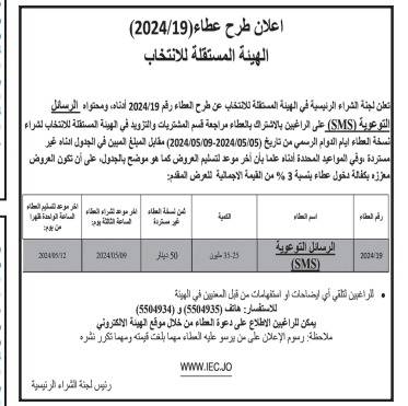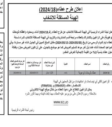 أعلنت لجنة الشراء الرئيسة في الهيئة المستقلة للانتخاب عن طرح 3 عطاءات، وهي عطاء 15 المتعلق بمطبوعات متفرقة، و18 لوحات توعوية، و19 الرسائل التوعوية.