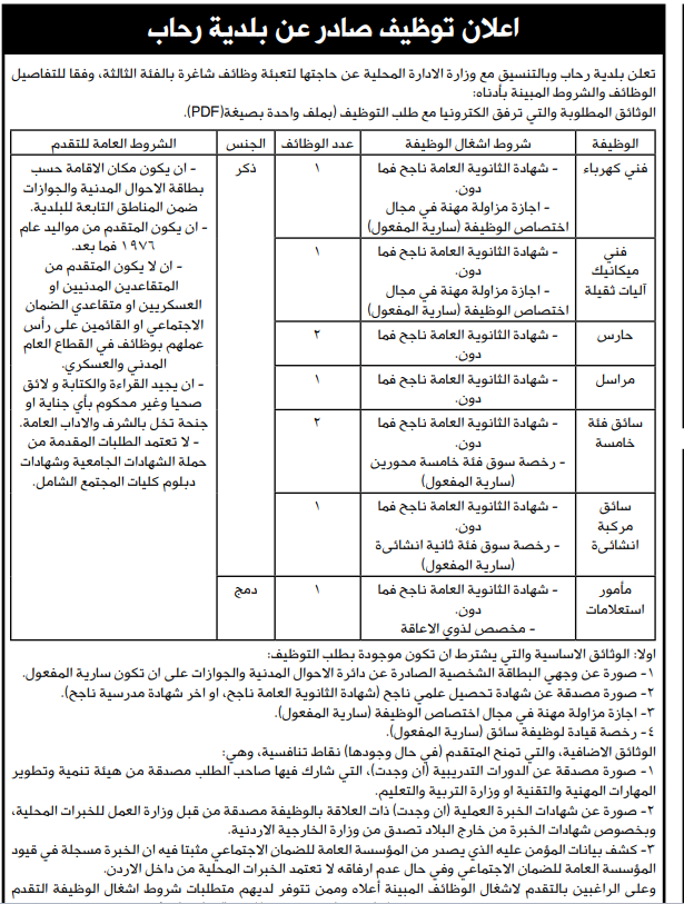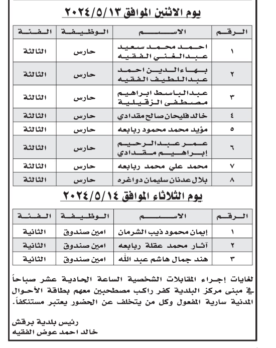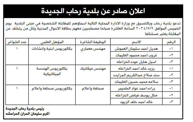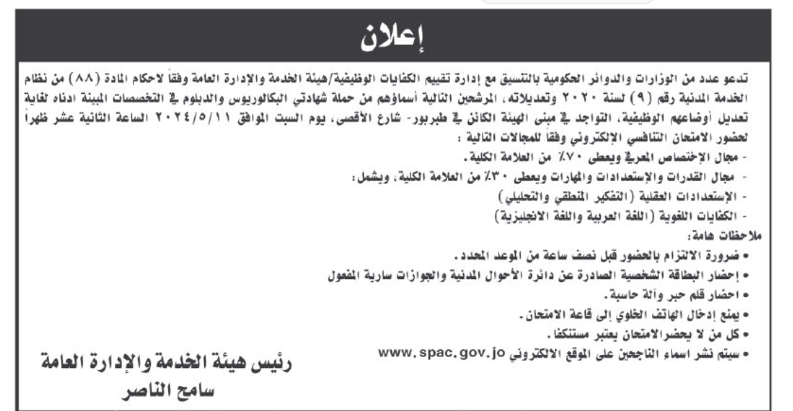 دعت عدد من المؤسسات الرسمية مرشحين لإجراء المقابلات الشخصية وتقديم الامتحان التنافسي واستكمال إجراءات التعيين، كما جهات أخرى عن وظائف شاغرة.