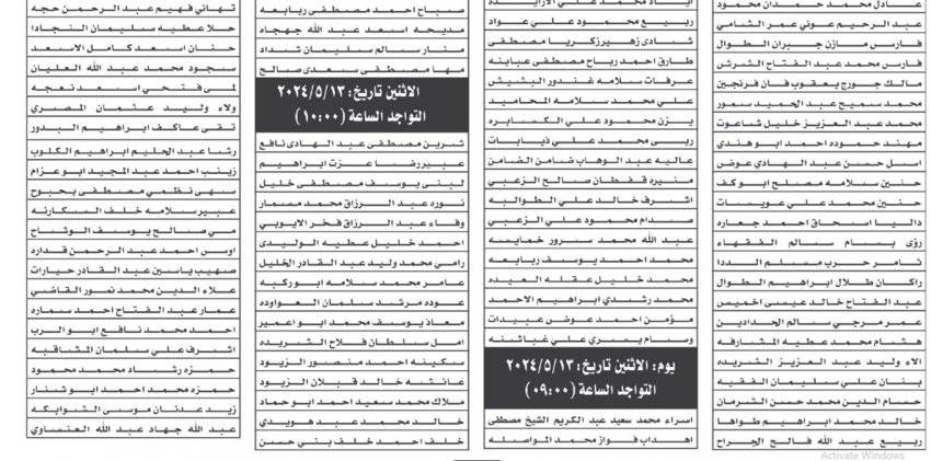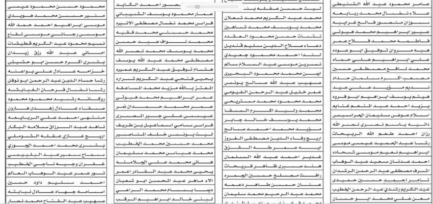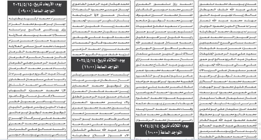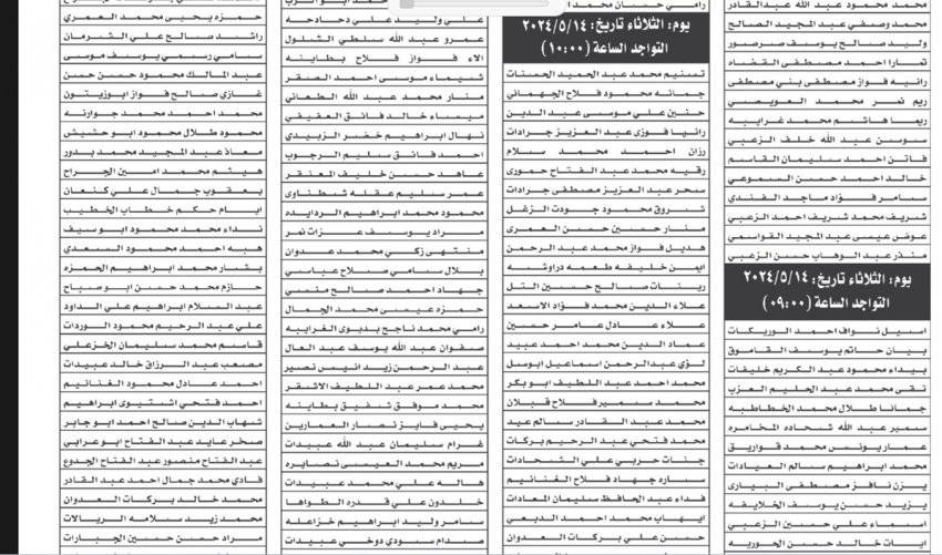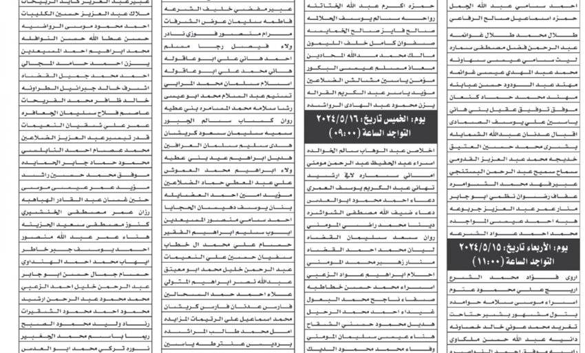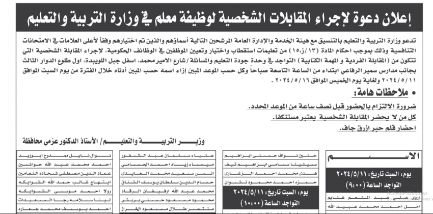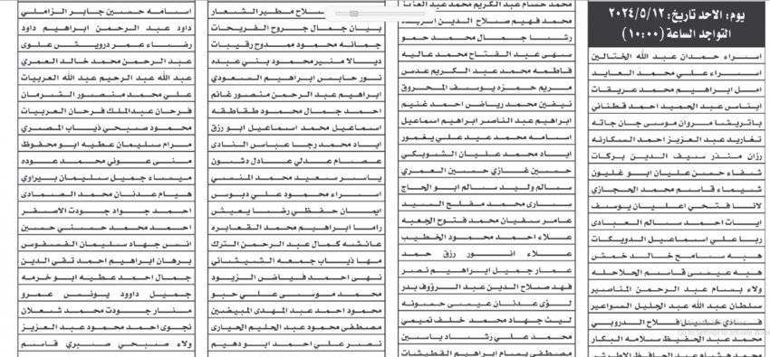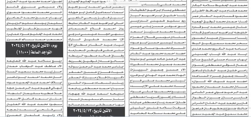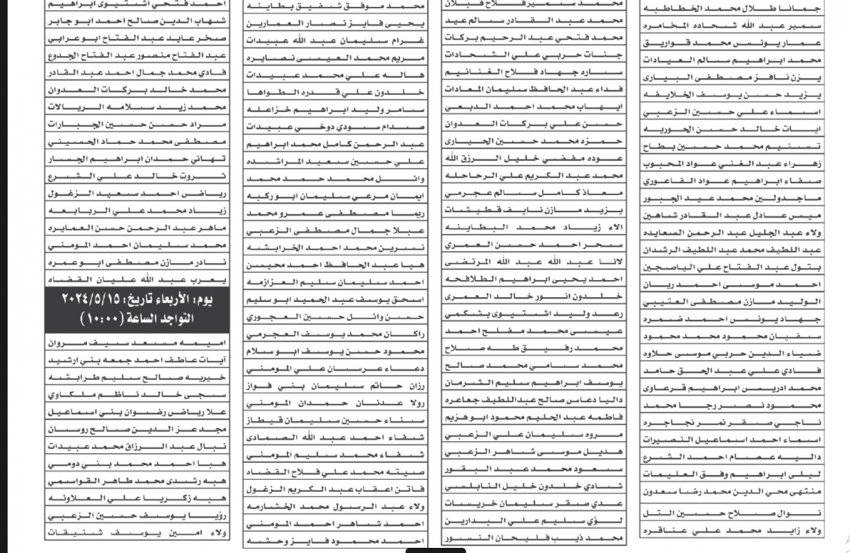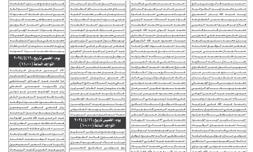 دعت وزارة التربية والتعليم المرشحين التالية أسماؤهم، والذين تم اختيارهم وفقا لأعلى العلامات في الامتحانات التنافسية وذلك بموجب احكام المادة (13) / ز (15) من تعليمات استقطاب واختيار وتعيين الموظفين في الوظائف الحكومية، لإجراء المقابلة الشخصية.