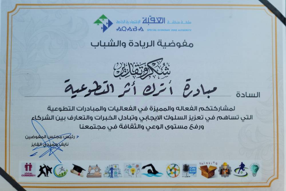 ادارة ومنسقين ومنتسبين مبادرة اترك آثر بدورها تقدم اجمل بطاقات الشكر والامتنان لسلطة منطقة العقبة الاقتصادية الخاصة ممثلة بمعالي الرئيس ومجلس المفوضين الموقر وجميع المديريات وكوادرها العاملة لخدمة وطننا الغالي و محافظة العقبة العزيزة في ظل حضرة صاحب الجلالة الملك عبدالله الثاني بن الحسين وولي عهده الامين امير الشباب سمو الأمير الحسين بن عبدالله معاهدين الله والوطن وقيادته ومعاهدين اهلنا في محافظة العقبة ان تبقى خطواتنا ثابتة نحو الأمام لتقديم الاجمل والافضل دائما وابدا لما فيه خدمة هذا الوطن والعقبة ومجتمعنا الحبيب .