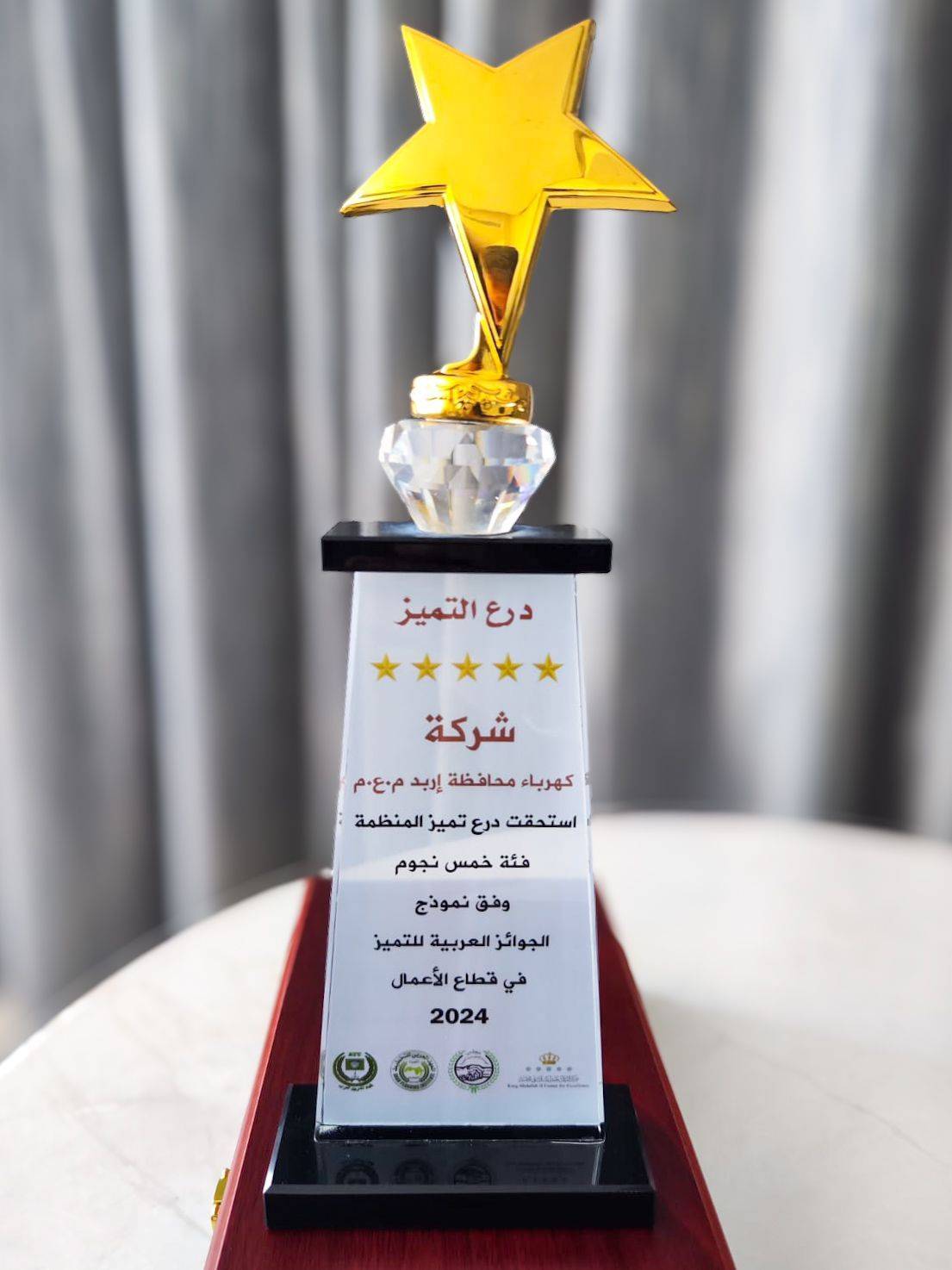 حصلت كهرباء إربد على درع التميز العربي وشهادة الاعتراف بالتميز حسب معايير جائزة التميز العربي التي أطلقت على هامش أعمال مؤتمر التميز العربي الثاني الذي أقيم مؤخرا في العاصمة القطرية الدوحة.