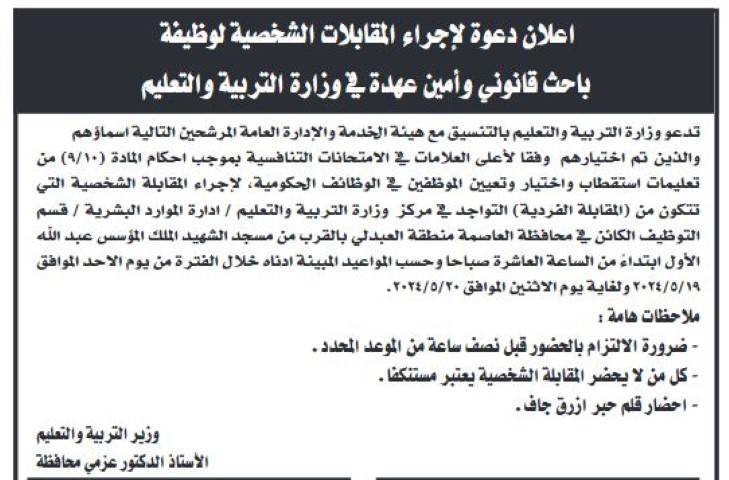 دعت عدداً من الوزارات والمؤسسات الرسمية بالتنسيق مع هيئة الخدمة الإدارة العامة اليوم الثلاثاء ، مرشحين لإجراء المقابلات الشخصية واستكمال إجراءات التعيين.