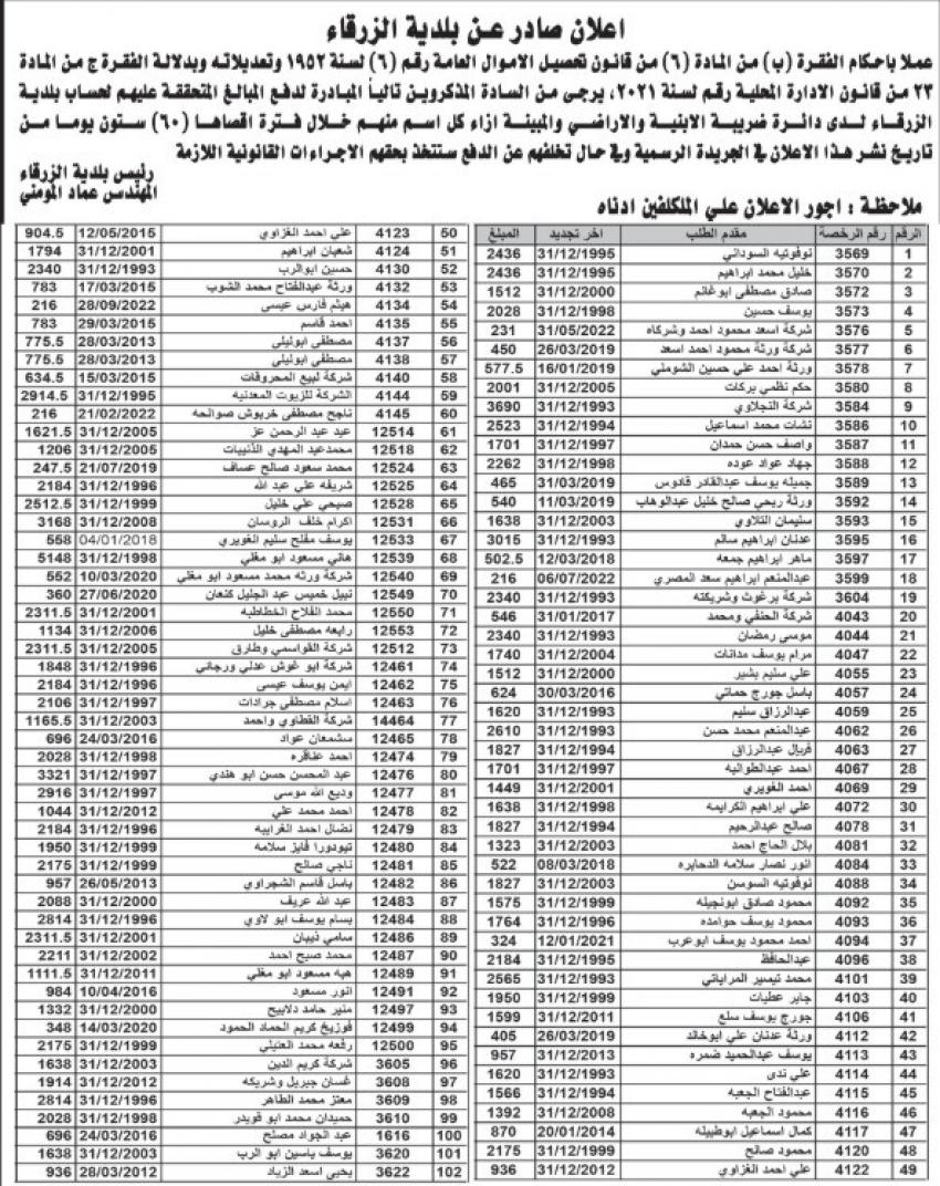 دعت بلدية الزرقاء التالية اسماؤهم المبادرة لدفع المبالغ المتحققة عليهم لحساب البلدية لدى دائرة ضريبة الأبنية والأراضي، خلال فترة اقصاها 60 يوما من تاريخ نشر الاعلان في الجريدة الرسمية.