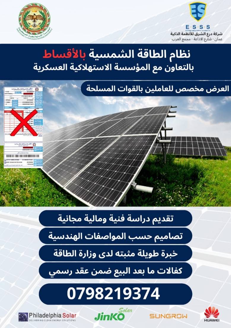 أعلنت المؤسسة الاستهلاكية العسكرية، يوم امس، عن توفير أنظمة الطاقه الشمسية بالأقساط وبسعر الكاش، لكافة منتسبي القوات المسلحة وسلاح الجو الملكي.