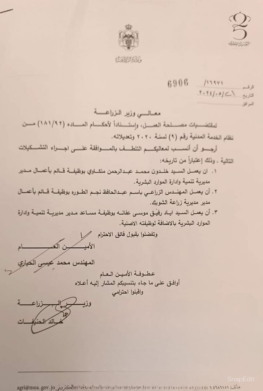 قرر وزير الزراعة المهندس خالد الحنيفات إجراء تشكيلات إدارية محدودة بين كبار الموظفين.
