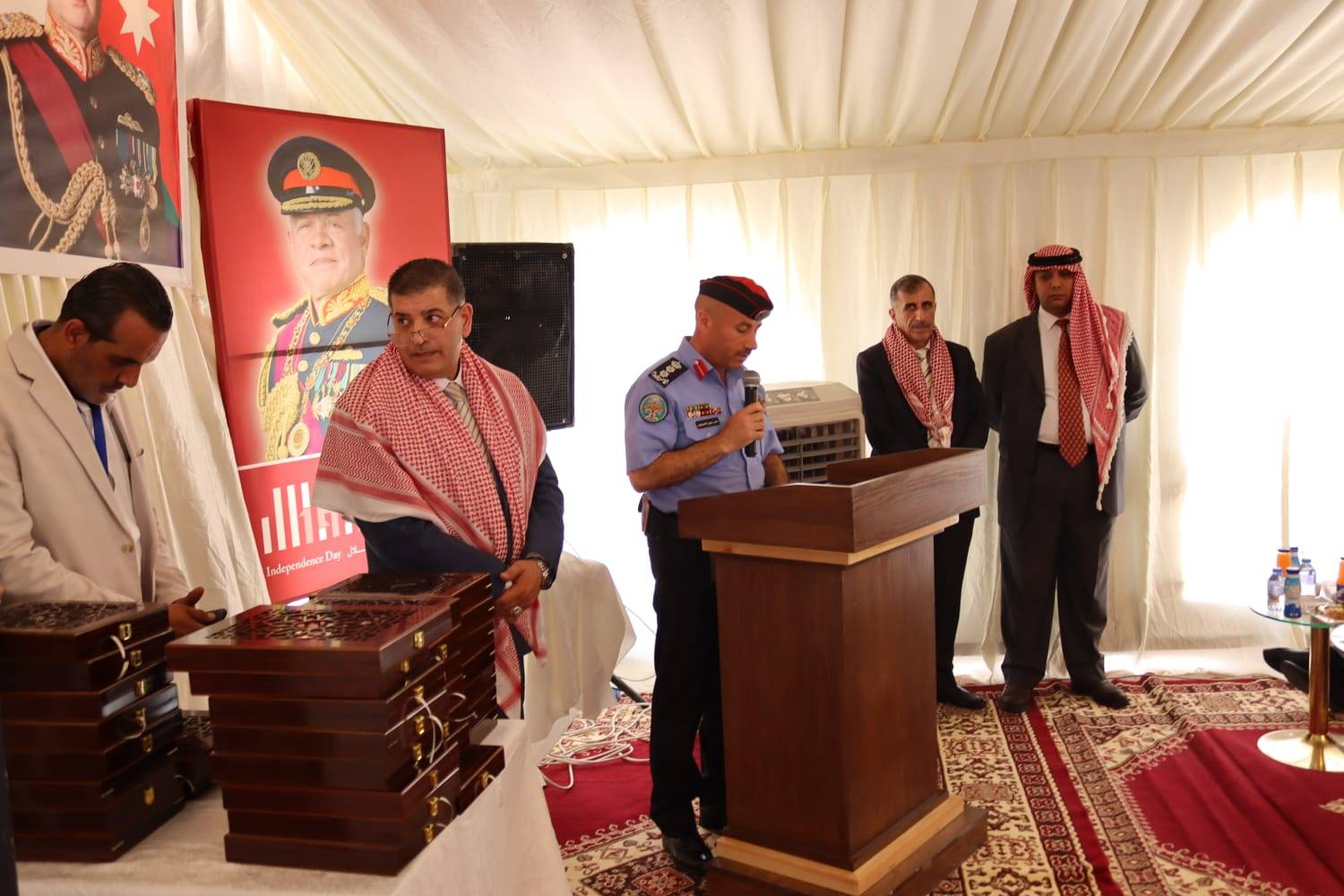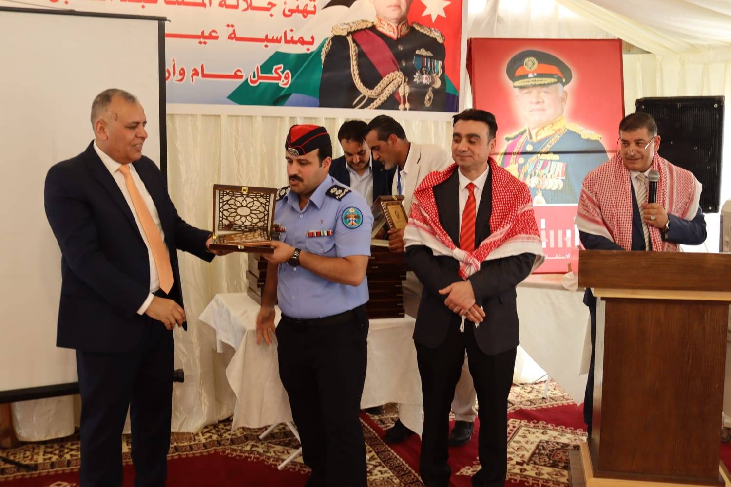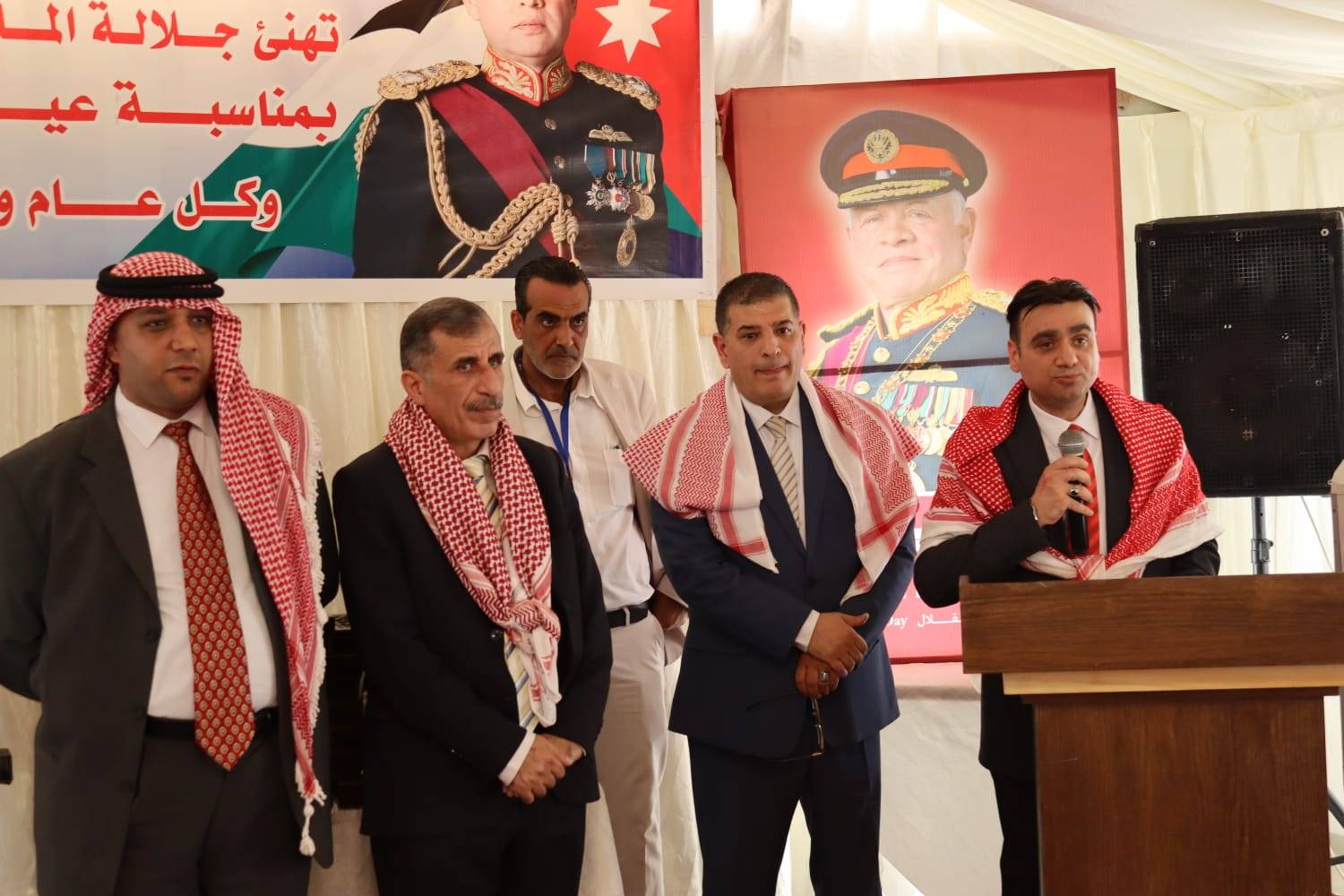 وتقدم محافظ الزرقاء بأسمى آيات التهنئة والتبريك لمقام حضرة صاحب الجلالة الهاشمية الملك عبدالله الثاني بن الحسين حفظه الله ورعاه بمناسبة اليوبيل الفضي للجلوس الملكي وعيد الاستقلال الثامن والسبعين والأعياد الوطنية، مستذكراً اليوم الذي تحققت فيه الآمال وأُعلن فيه بزوغ فجر المملكة الاردنية الهاشمية، بالإضافة لحديثه عن مواقف الهاشميين وجلالة الملك في الدفاع عن القضية الفلسطينية والمقدسات الإسلامية والمسيحية في القدس الشريف.