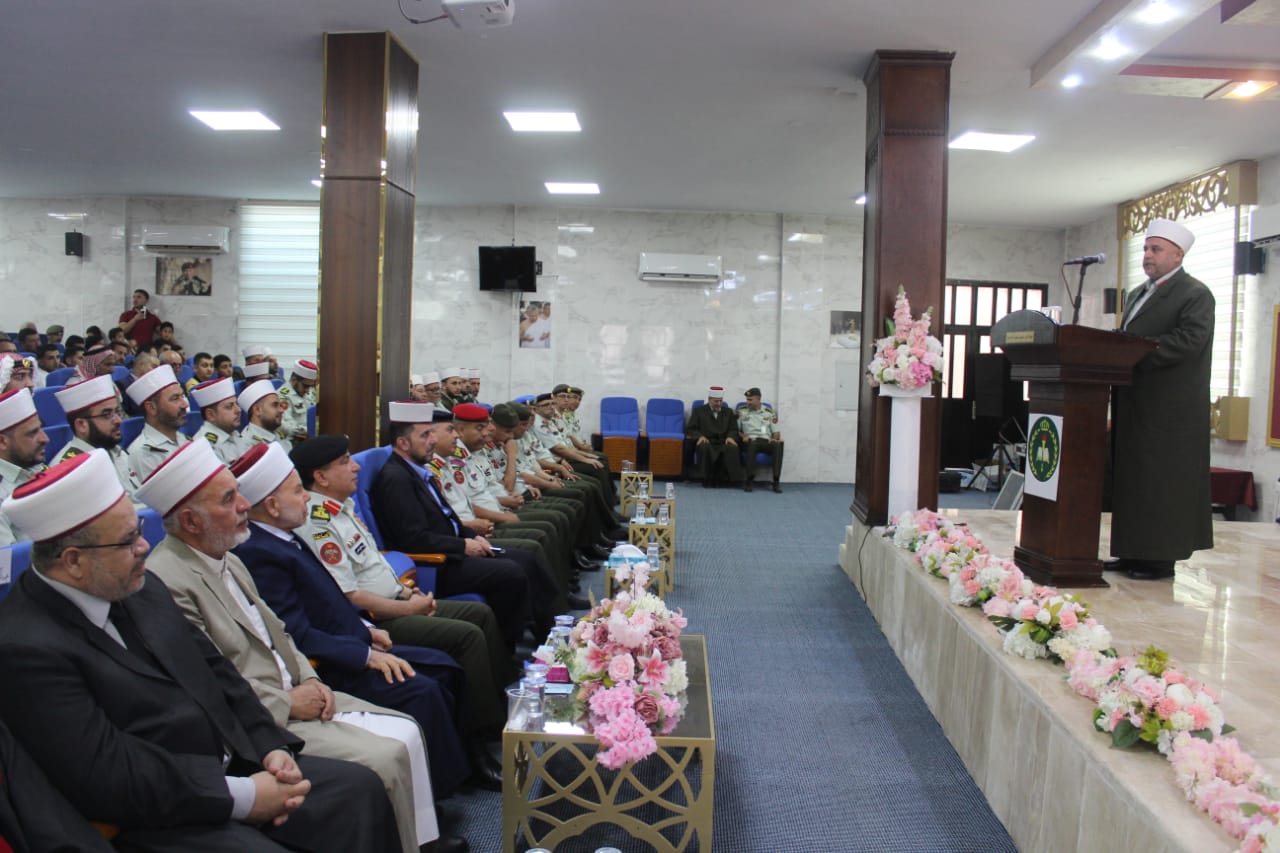 وألقى مفتي القوات المسلحة كلمة قال فيها: نتشرف في هذا اليوم ونحن نعيش هذه الأيام مناسبات وطنية اليوبيل الفضي ويوم الجيش عزيزة على قلوبنا، بتخريج نخبة من علماء الدين الاسلامي لتنضم هذه النخبة المؤهلة بالفقه الاسلامي والتدريب العسكري لوحدات قواتنا المسلحة، حيث أنهى الخريجون متطلبات درجة البكالوريوس من الفقه وأصوله والعلوم العسكرية بعمل متكامل واشراف من الهيئتين التدريسية والادارية وشعبة العلوم العسكرية.
