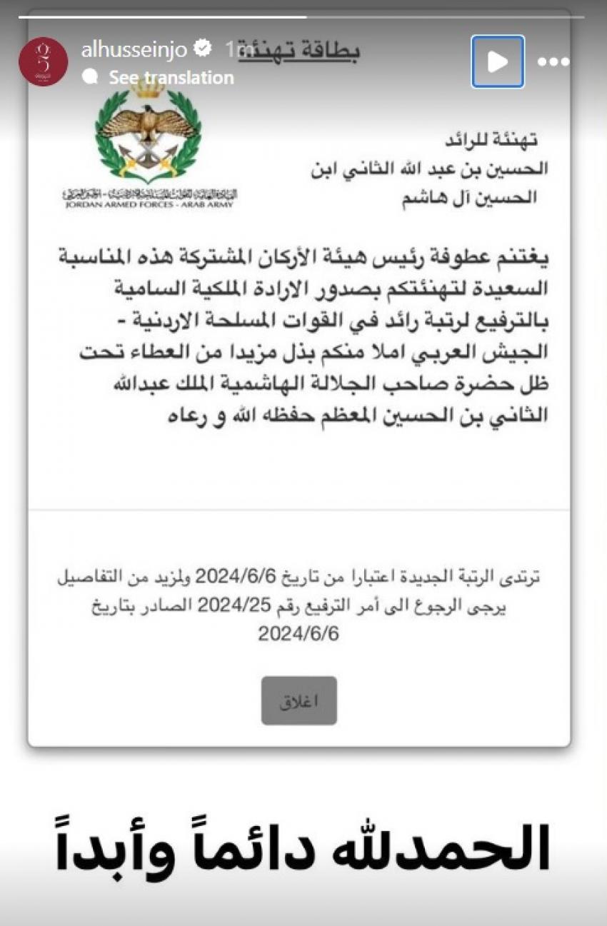 نشر ولي العهد الأمير الحسين بن عبدالله الثاني، عبر حسابه في موقع تبادل الصور انستغرام صورة لبطاقة التهنئة بمناسبة ترفيعه إلى رتبة رائد في الجيش العربي، بعد صدور الإرادة الملكية السامية.