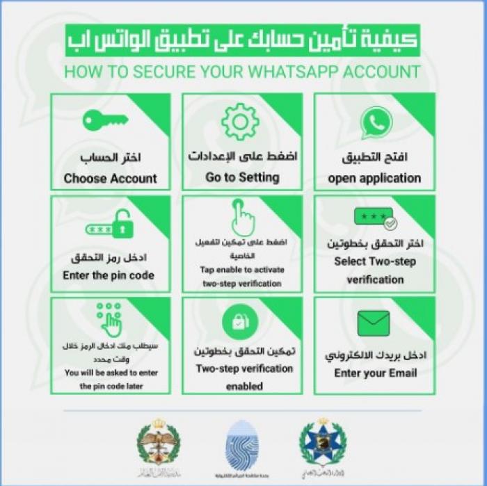 قالت وحدة مكافحة الجرائم الإلكترونية في مديرية الأمن العام في منشور لها عبر صفحتها الرسمية على موقع التواصل الاجتماعي "فيسبوك"إنها تتعامل مع العديد من الشكاوى والبلاغات المتعلقة باختراق الحسابات على تطبيق التراسل الفوري "واتساب".