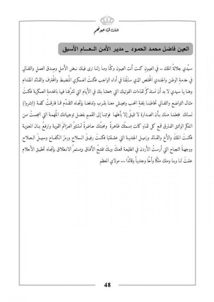 سيّدي جلالةُ الملك .. في العيونِ كنت أنت العيون وكنّا وما زلنا نرى فيك نبض الأملِ وصِدق العملِ والتفاني في خدمةِ الوطن والجندي المُخلص الذي سابَقنا في أداءِ الواجب فكنتَ العسكري المُنضبط والمُحترف والقائد المقدام.