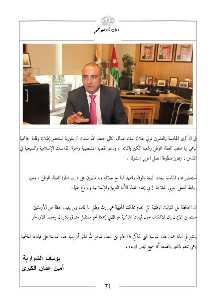 وننتهز في امانة عمان هذه المناسبة التي تحاكي 25 عام من العطاء لندعو الله تعالى أن يعيد هذه المناسبة على قيادتنا الهاشمية وهي تنعم بالخير والصحة أنه سميع مجيب الدعاء .