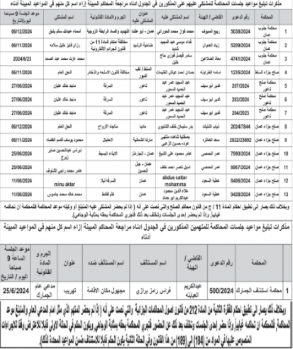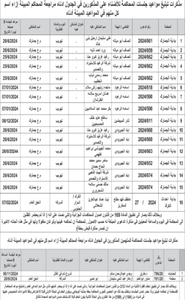 : صدرت مذكرات تبليغ بمواعيد جلسات قرارات الامهال لتسليم التالي أسماؤهم لأنفسهم الى السلطات القضائية .