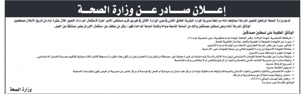 نيروز الإخبارية : دعت وزارة الصحة المرشحين للتعيين والمدرجة اسماؤهم أدناه مراجعة مديرية الموارد البشرية الطابق الثاني في مبنى الوزارة الكائن في طبربور قرب مستشفى الأمير حمزة لاستكمال إجراءات التعيين خلال عشرة أيام من تاريخ الإعلان مصطحبين الوثائق المدرجة أدناه، وعلى نسختين مصدقتين.