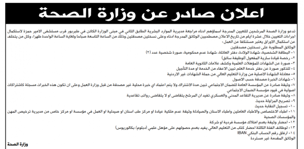 نيروز الإخبارية : دعت وزارة الصحة المرشحين المدرجة اسماؤهم ادناه، مراجعة مديرية الموارد البشرية الطابق الثاني في مبنى الوزارة الكائن في طبربور قرب مستشفى الأمير حمزة، لاستكمال اجراءات التعيين خلال عشرة ايام من تاريخ الإعلان، مصطحبين الوثائق المدرجة ادناه وعلى نسختين مصدقتين.