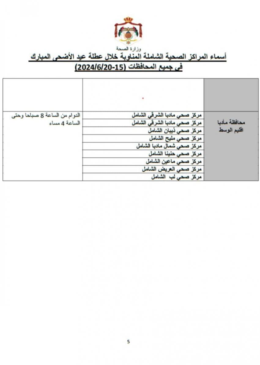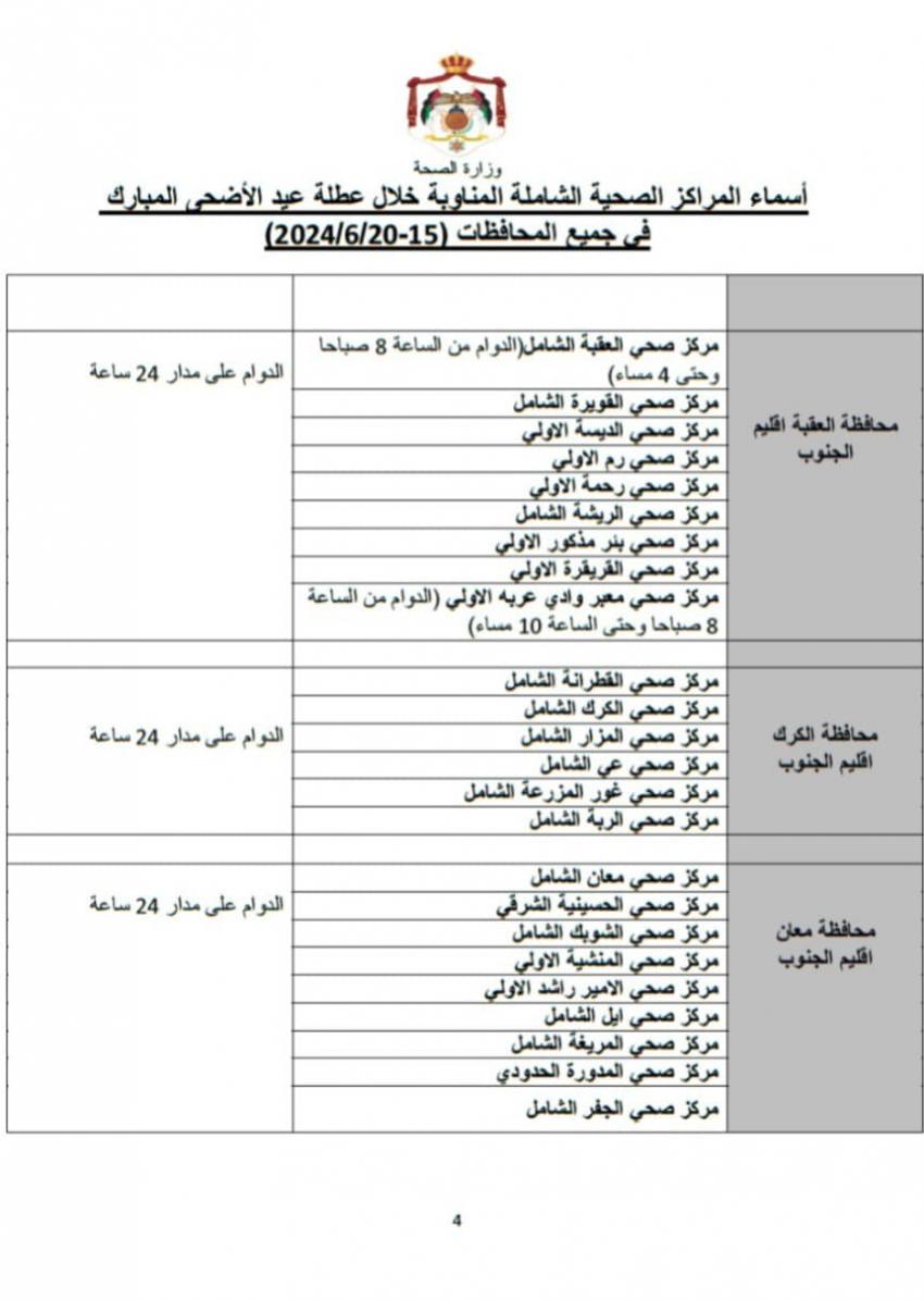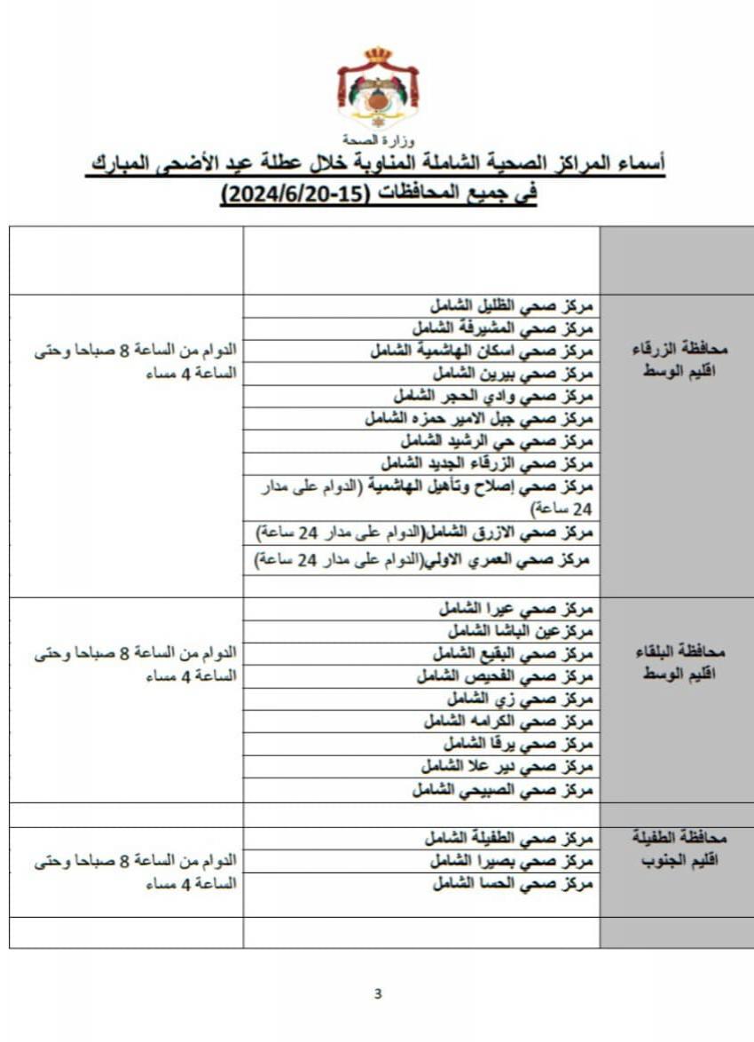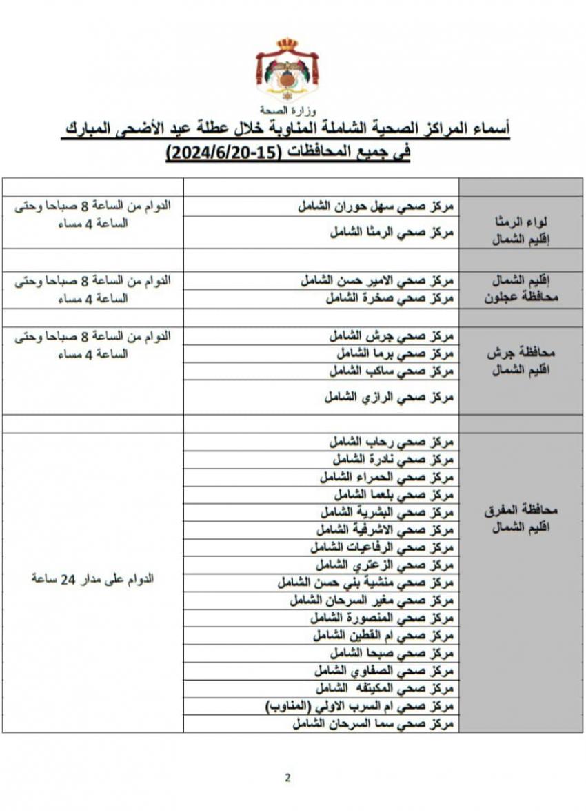 أعلنت وزارة الصحة أسماء 111 مركزا صحيا شاملا مناوبا خلال عطلة عيد الأضحى المبارك وفي كافة محافظات المملكة.
