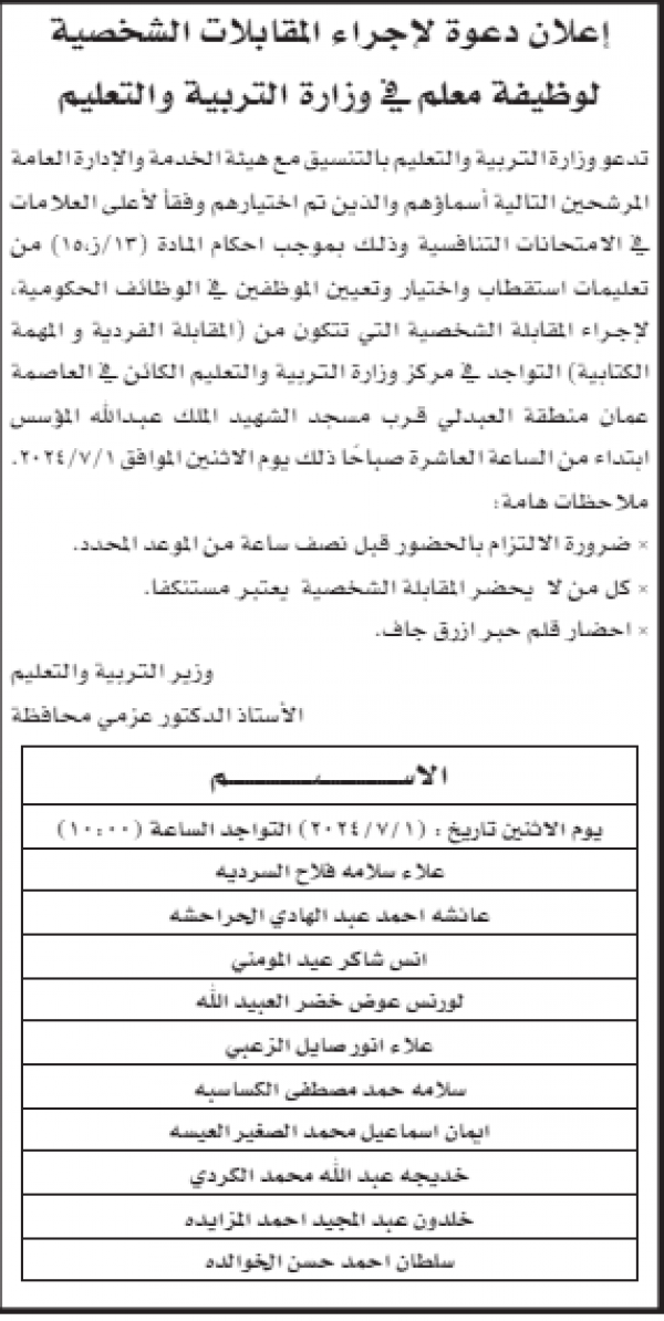 : دعت وزارة التربية والتعليم مرشحين لإجراء المقابلات الشخصية لاستكمال إجراءات التعيين.