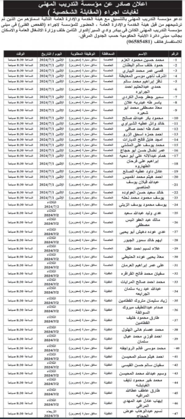 كما دعت مؤسسة التدريب المهني عدد من المرشحين لإجراء الفحص الفني.