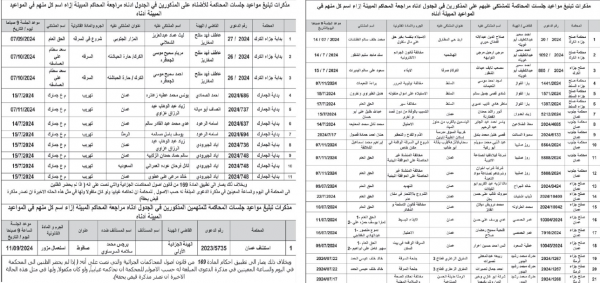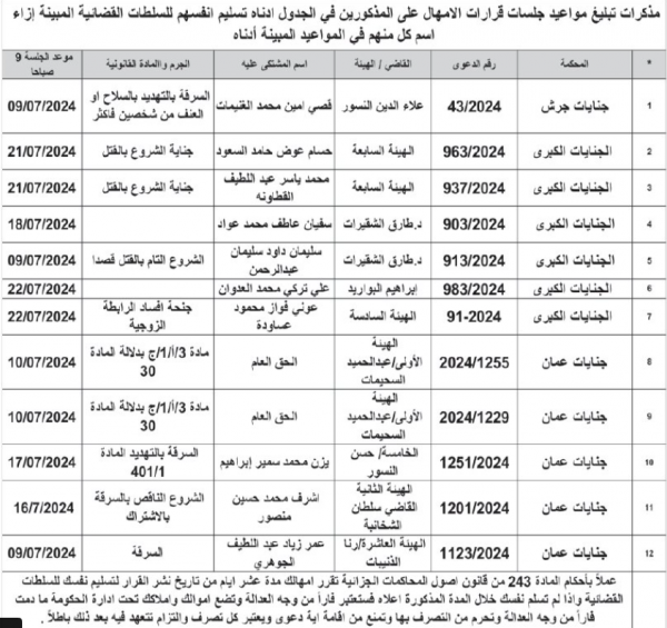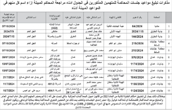 : صدرت مذكرات تبليغ اليوم الثلاثاء، بمواعيد جلسات المحاكمة لمشتكى عليهم في المحاكم النظامية.