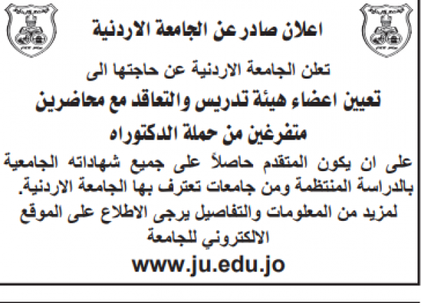 : أعلنت الجامعة الأردنية عن حاجتها الى تعيين اعضاء هيئة تدريس ومحاضرين متفرغين من حملة شهادة الدكتوراة.
