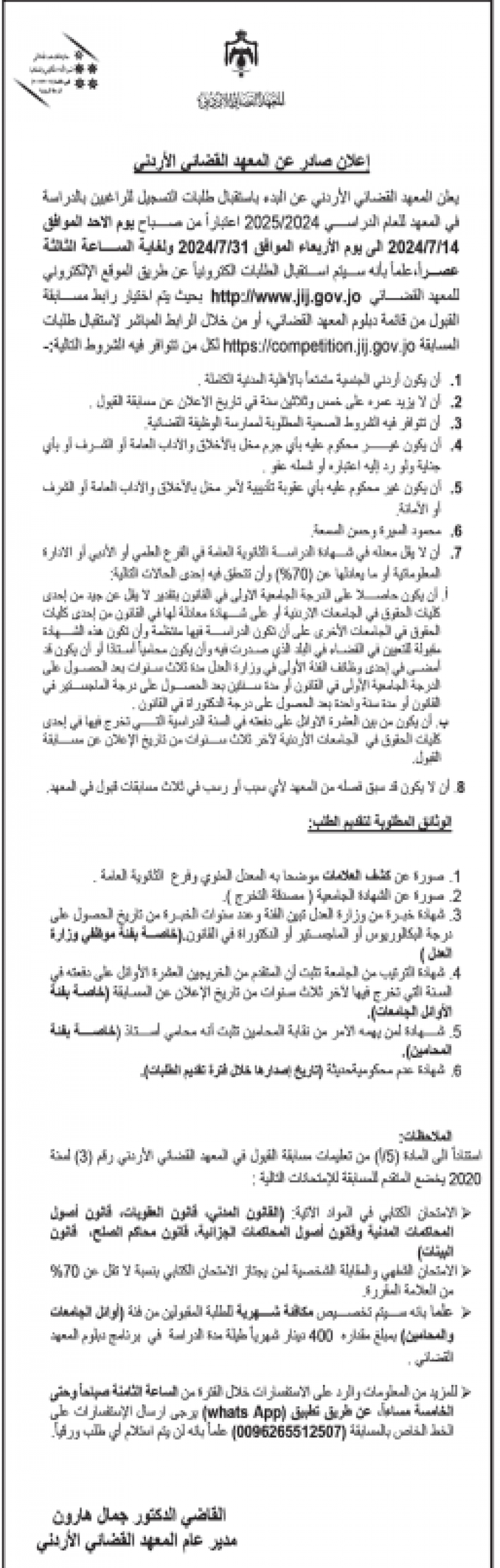 : أعلن المعهد القضائي الأردني الأربعاء عن البدء باستقبال طلبات التسجيل للراغبين بالدراسة في المعهد للعام الدراسي 2024/2025 الكترونيا عبر الموقع الالكتروني للمعهد.