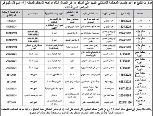 مذكرات تبليغ مواعيد جلسات محاكمة لأردنيين (أسماء)
