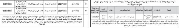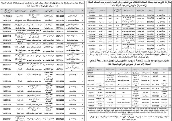 : صدرت مذكرات تبليغ اليوم الاثنين، بمواعيد جلسات المحاكمة لمشتكى عليهم في المحاكم النظامية.