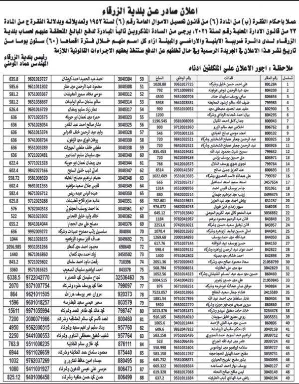 نيروز الإخبارية : دعت بلدية الزرقاء اليوم الاثنين مواطنين ترتبت عليهم مبالغ مالية لحساب البلدية لدى دائرة ضريبة الأبنية والأراضي، المبادرة بتسديدها خلال فترة أقصاها 60 يوماً.