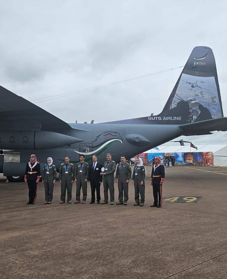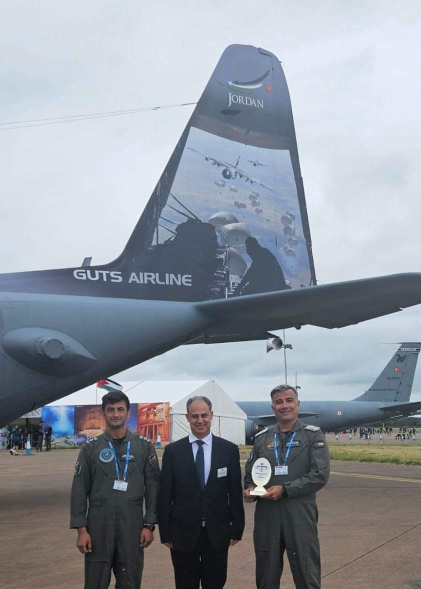 بدوره قال قائد جناح النقل الجوي العقيد الركن الطيار عماد بزادوغ : إن لجنة المحكمين الدوليين في المعرض لمسوا في التصميم الخارجي لطائرة C130 الرسالة الإنسانية في صورة الإنزالات الجوية الإغاثية لقطاع غزة، والجهود التي تبذلها مرتبات السلاح تجاه هذا الواجب الإنساني، إضافةً إلى احترافية التصميم في صورة شعار اليوبيل الفضي الذي يمثل 25 عاماً لاستلام جلالة الملك سلطاته الدستورية والذي صُمم بدقة متناهية حصلنا خلالها على جائزة العرض الثابت في أكبر معرض عسكري دولي على مستوى العالم.