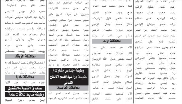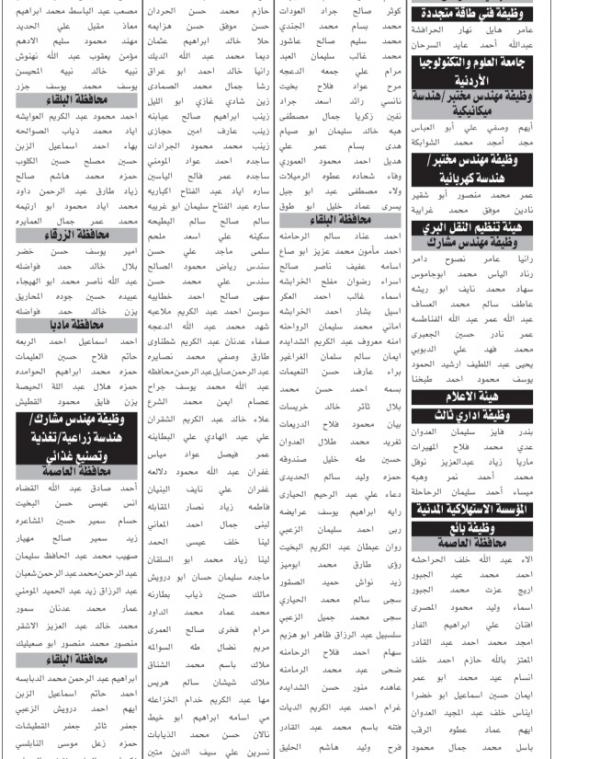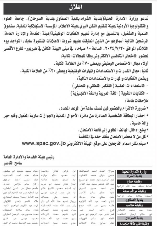 نيروز الإخبارية : دعت وزارة الادارة المحلية (بلدية الشراه, بلدية الصفاوي, بلدية السرحان) وجامعة العلوم والتكنولوجيا، وهيئة تنظيم النقل البري، وهيئة الإعلام، والمؤسسة الاستهلاكية المدنية، وصندوق التنمية والتشغيل، بالتنسيق مع دائرة تقييم الكفايات الوظيفية/هيئة الخدمة والإدارة العامة، المرشحين التالية أسماؤهم لحضور الامتحان التنافسي الإلكتروني وفقا للتفاصيل التالية: