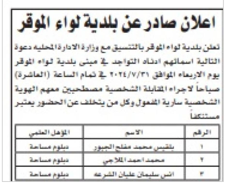 دعت  بلدية لواء الموقر بالتنسيق مع وزارة الادارة المحلية، أسماء مرشحين للتعيين لاجراء مقابلة شخصية .