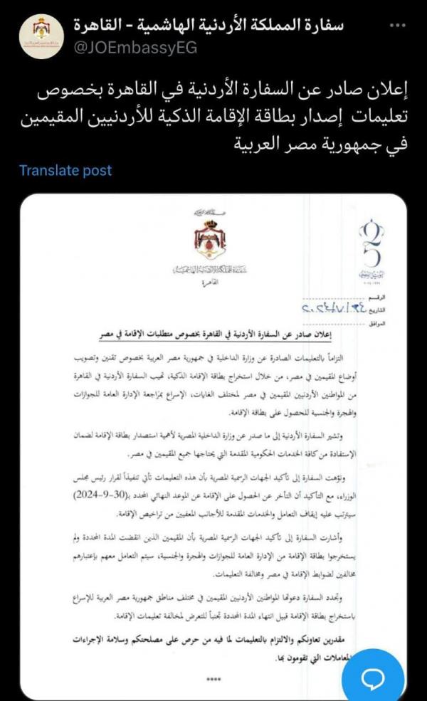 وتشير السفارة الأردنية إلى ما صدر عن وزارة الداخلية المصرية لأهمية استصدار بطاقة الإقامة لضمان الإستفادة من كافة الخدمات الحكومية المقدمة التي يحتاجها جميع المقيمين في مصر.