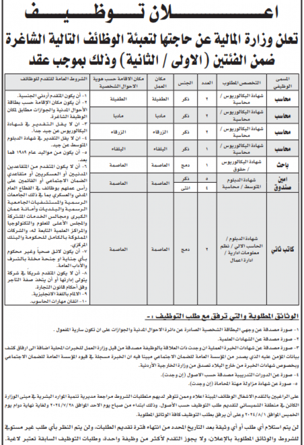 نيروز الإخبارية : أعلنت وزارة المالية عن حاجتها لتعبئة وظائف شاغرة لديها ضمن الفئتين (الأولى / الثانية) وذلك بموجب عقد.
