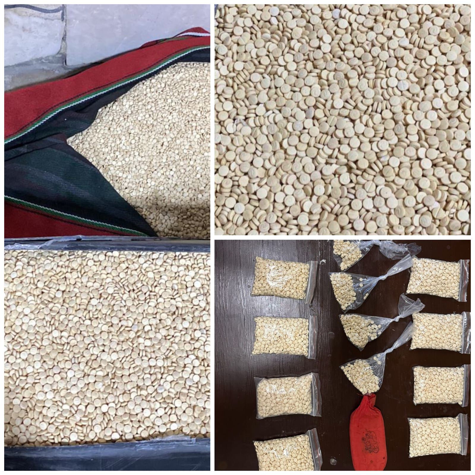 فيما وردت في القضية الثانية معلومات حول قيام شخصين بتجهيز كميات من الحبوب المخدرة ووضعها بمخبأ سري بإحدى مركبات الشحن تهميدا لتهريبها لدولة مجاورة ، حيث جرى من خلال التحقيقات تحديد هوية الشخصين ومكان وموعد نقلهما للحبوب المخدرة في محافظة الزرقاء وجرت مداهمتهما أثناء توجههما للمعبر الحدودي وأُلقي القبض عليهما وضبط داخل مخبأ سري 200 ألف حبة مخدرة .