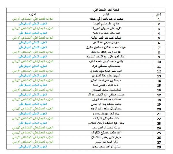 نيروز الإخبارية : أعلن تحالف "التيارُ الديمقراطي"ّ الذي يضم الحزبين " الديمقراطي الاجتماعي الأردني " و "المدني الديمقراطي الأردني"، تسجيل قائمته العامة لدى الهيئة المستقلة للانتخابات هذا الصباح، وتكوّنت القائمةُ من ثمانيةٍ وعشرين عضواً؛