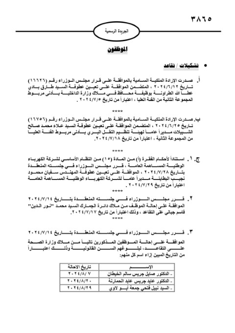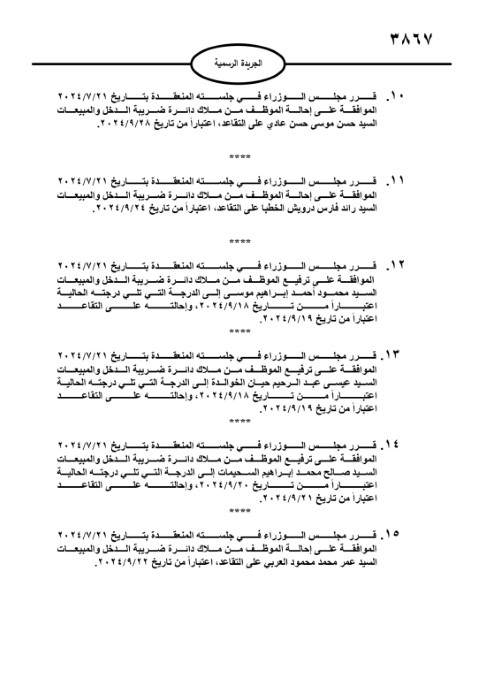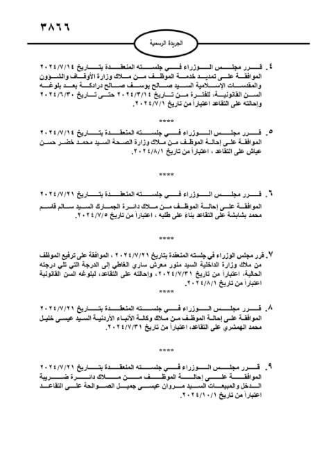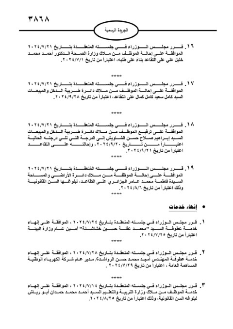 قرر مجلس الوزراء في عدد الجريدة الرسمية الصادر اليوم الخميس ، إحالة موظفين في عدد من الوزارات والدوائر إلى التقاعد.