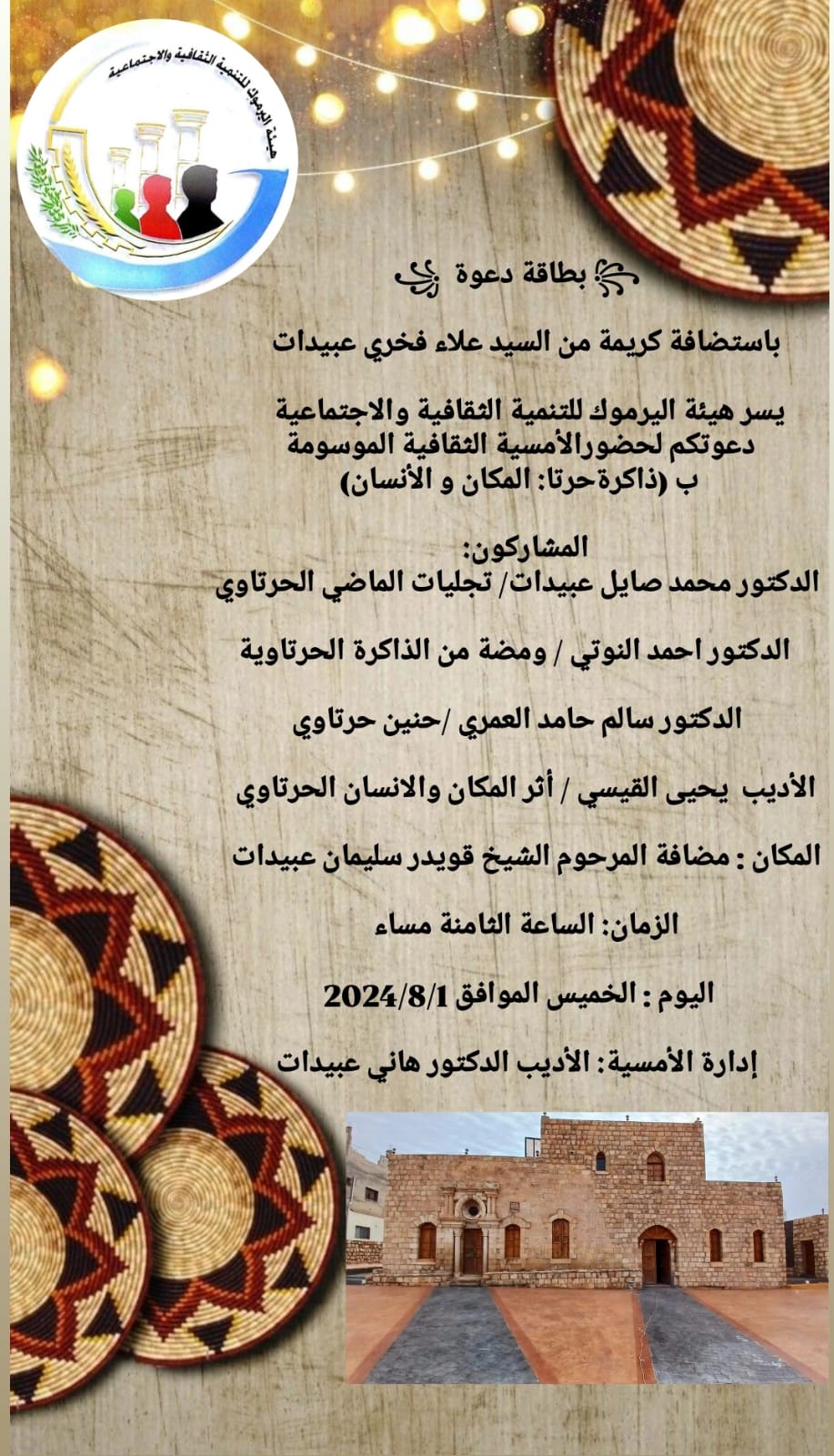 وسط حضور مهيب من المجتمع المحلي وعشاق التراث من مختلف مناطق محافظة اربد، استضاف حفيد الشيخ قويدر عبيدات، المهندس علاء فخري عبيدات في مضافة جده قويدر سليمان عبيدات أمسية ثقافية تراثية تحت عنوان (ذاكرة حرثا، المكان والانسان)، وبتنظيم من هيئة اليرموك للتنمية الثقافية والاجتماعية ممثلة بالسيد خالد إسكندر عبيدات، وبحضور الشريف عبدالله الهجاري من المملكة العربية السعودية ورئيس تجمع اربد للمتقاعدين العسكريين العميد المتقاعد محمد المناجرة ، وادار مفردات الحفل الاديب الدكتور هاني عبيدات.
