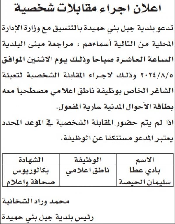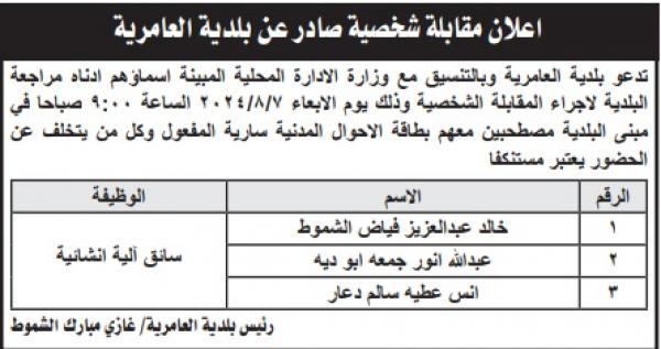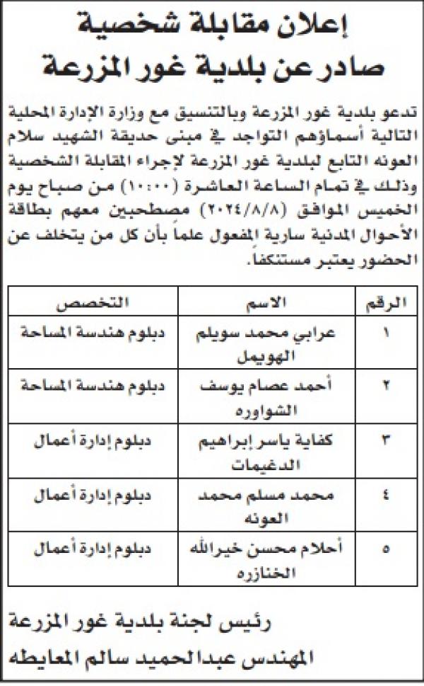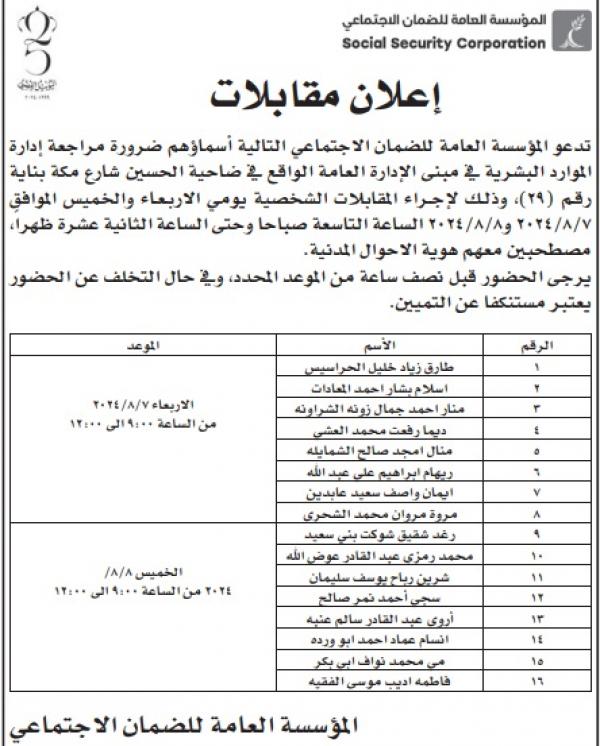 : دعت عدد من الوزارات والمؤسسات الحكومية ،اليوم الأحد، التالية اسماؤهم لاجراء المقابلات الشخصية لغايات التعيين.