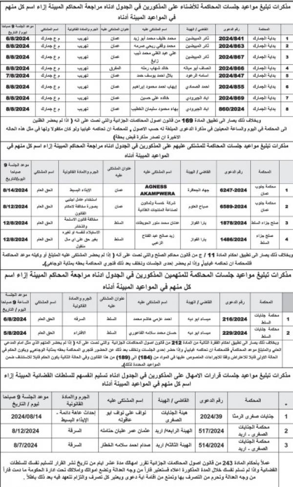 مذكرات تبليغ مواعيد جلسات محاكمة لأردنيين (أسماء)