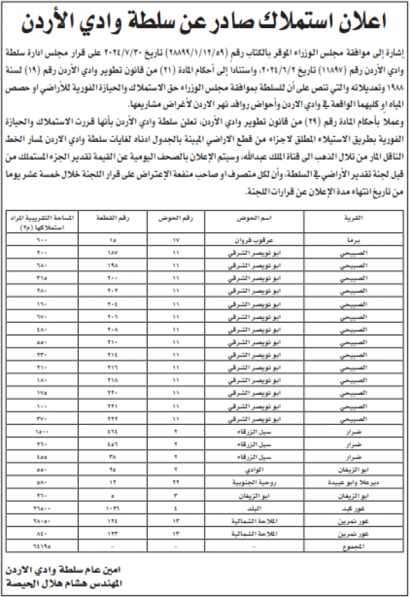 نيروز الإخبارية : أعلنت سلطة وادي الأردن اليوم الثلاثاء، أنها قررت الاستملاك والحيازة الفورية بطريق الاستيلاء المطلق لأجزاء من قطع أراض لغايات مسار الخط الناقل المار من تلال الذهب إلى قناة الملك عبدالله، وذلك استنادا إلى قانون تطوير وادي الأردن.