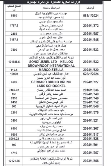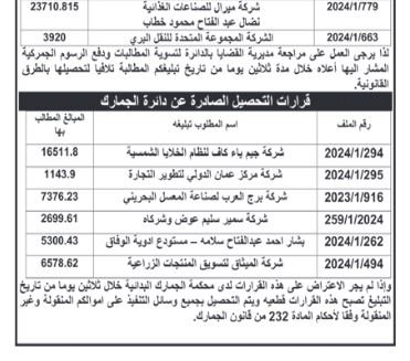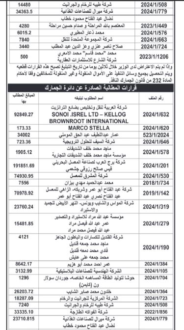 أعلنت دائرة الجمارك الأردنية، اليوم الأربعاء، قرارات تغريم ومطالبة وتحصيل صادرة بحق عدة أشخاص وشركات.