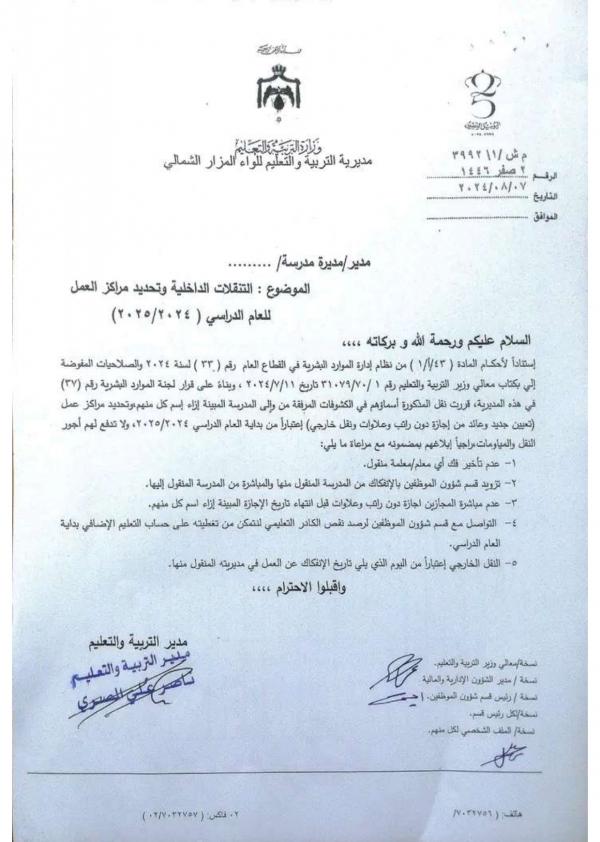 : عممت مديرية التربية والتعليم في لواء المزار الشمالي، باجراء تنقلات داخلية وتحديد مراكز عمل لمعلمين وموظفين إعتبارا من بداية العام الدراسي الجديد 2024/2025.
