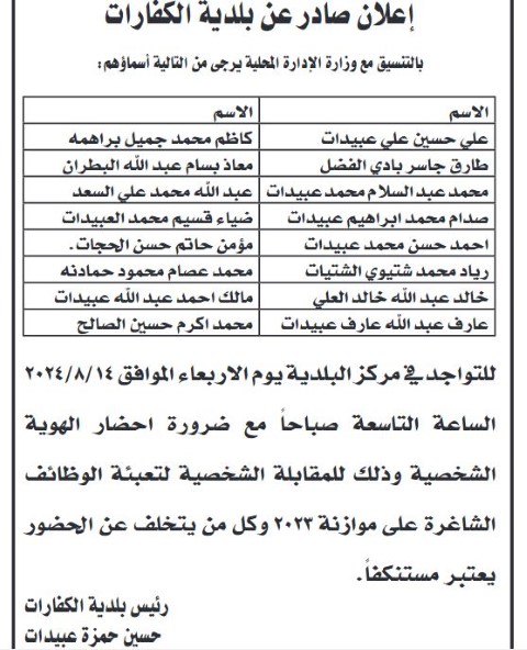 أعلنت عدداً من البلديات والمؤسسات، اليوم الإثنين، عن حاجتهم لتعبئة وظائف شاغرة، فيما دعت عددا من المرشحين لاجراء المقابلات الشخصية.