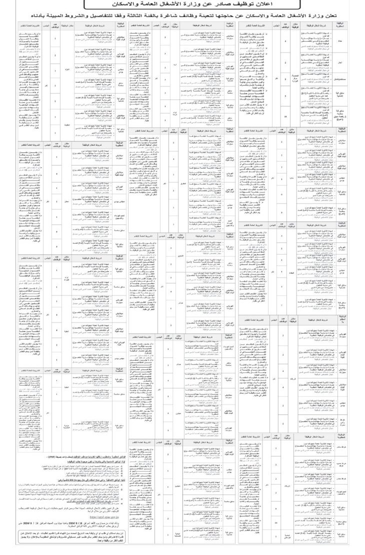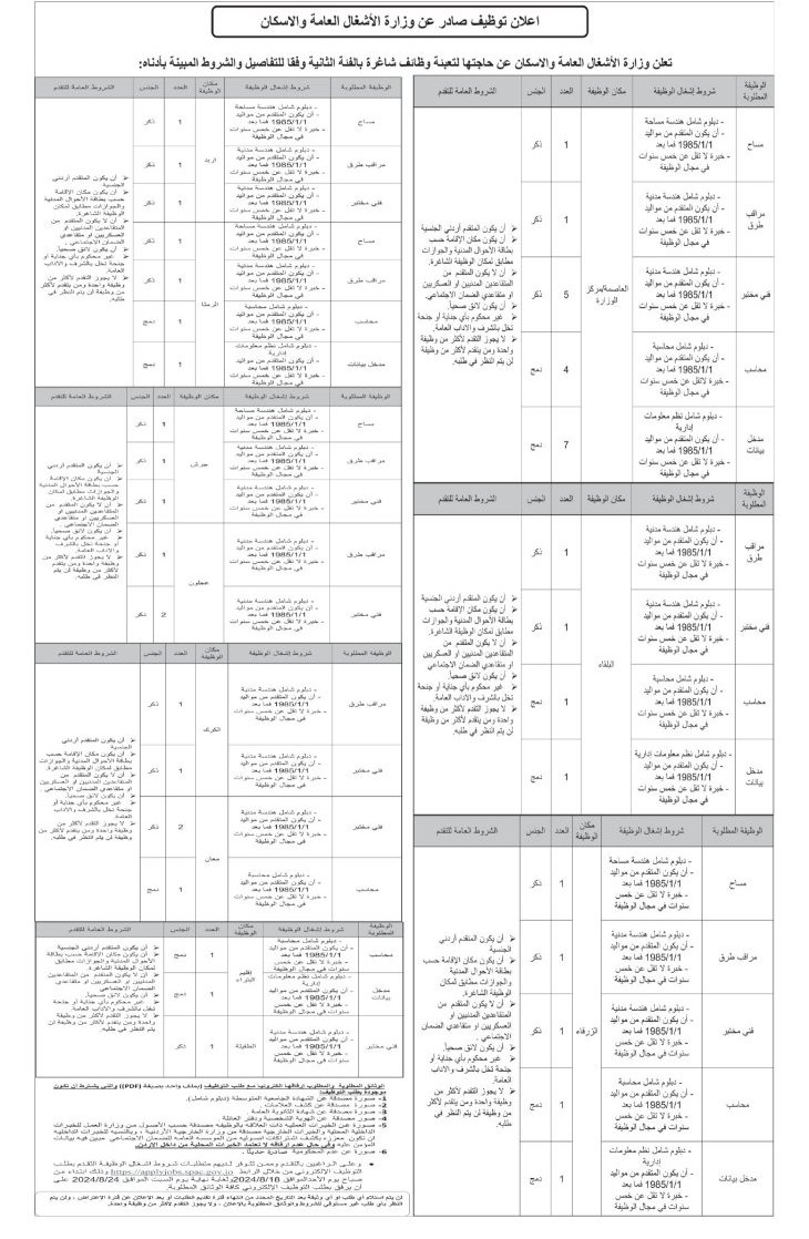 أعلنت وزارة الأشغال العامة والإسكان اليوم الثلاثاء عن حاجتها لتعبئة وظائف شاغرة بالفئتين الثانية والثالثة.