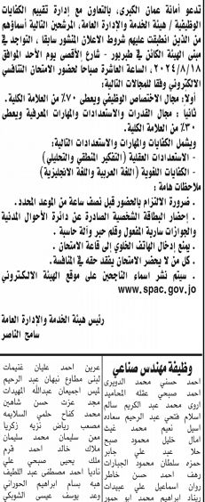 دعت أمانة عمان الكبرى بالتنسيق والتعاون مع هيئة الخدمة والادارة العامة، المرشحين أسماء مرشحين لحضور الامتحان التنافسي الالكتروني يوم الاحد 18 آب المقبل .