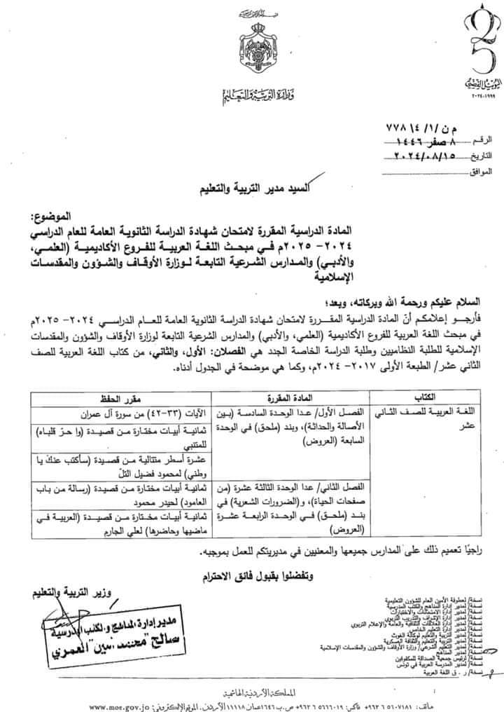 عممت وزارة التربية والتعليم على جميع مديرياتها بالمادة المقررة لإمتحان شهادة الدراسة الثانوية العامة للعام الدراسي 2024-2025 في مبحث اللغة العربية للفرعين (العلمي والأردبي) والمدارس الشرعية التابعة لوزارة الأوقاف والشؤون والمقدسات الإسلامية للطلبة النظاميين وطلبة الدراسة الخاصة الجدد.