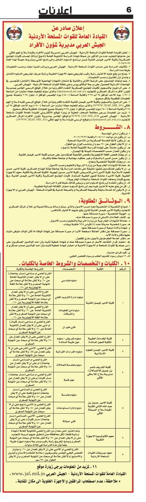 أعلنت القيادة العامة للقوات المسلحة وقيادة سلاح الجو الملكي عن حاجتها لتجنيد عدد من الذكور من حملة شهادة الثانوية العامة (ناجح) لحساب كليات المجتمع العسكرية وكلية الأمير فيصل الفنية ضمن برنامج الدبلوم الشامل والبرنامج الفني.