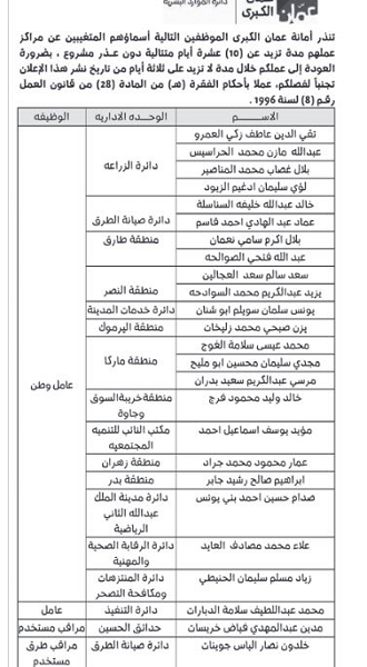 : أنذرت أمانة عمان الكبرى، اليوم الأحد، 25 عامل وطن ومراقب مستخدم، بالعودة الى عملهم خلال 3 أيام ، والا سيتم فصلهم نتيجة تغيبهم عن العمل لمدة تزيد عن 10 أيام.