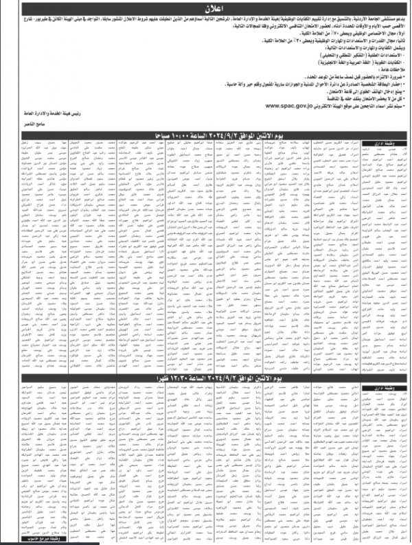 : دعت وزارات ومؤسسات حكومية وبلديات ،اليوم الاثنين، بالتنسيق مع بالتنسيق مع ادارة تقييم الكفايات الوظيفية/ هيئة الخدمة والادارة العامة مرشحين للتعيين لحضور الامتحان التنافسي او للمقابلات الشخصية لغايات استكمال التعيين.