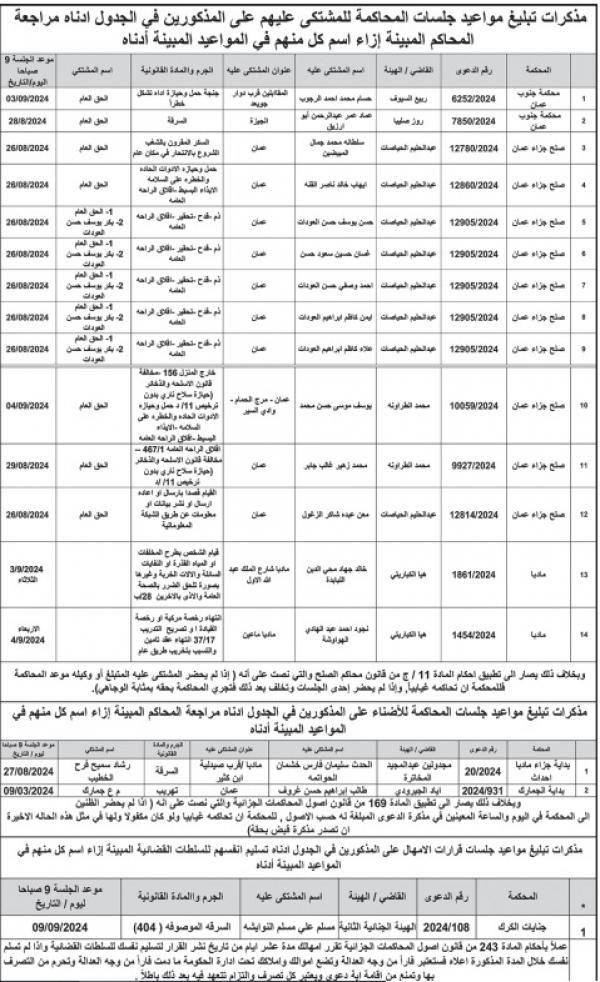 وطلبت المذكرات من المذكورين في الجداول أدناه مراجعة المحاكم المبينة ازاء اسم كل منهم في المواعيد المبينة.